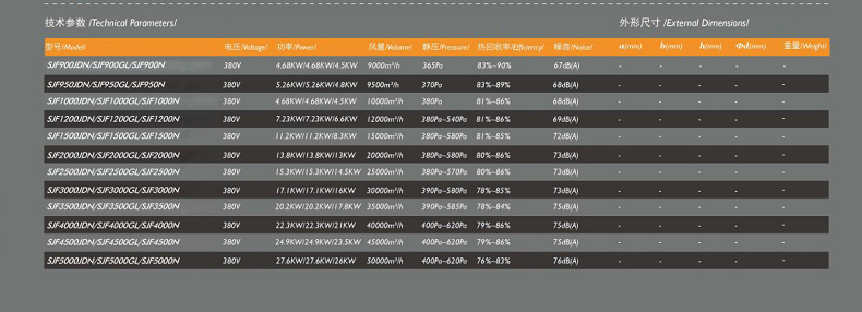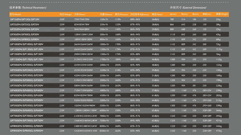 SJF100JDN/SJF100GL/SJF100N | 220v | 266w/266w/260w | 1000m3/h | 170pa | 86%-91% | 36dB(A) | 1143 | 809 | 342 | 200 | 72KG |