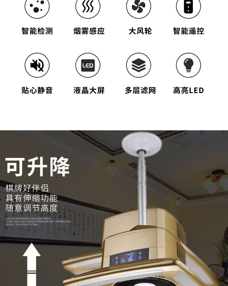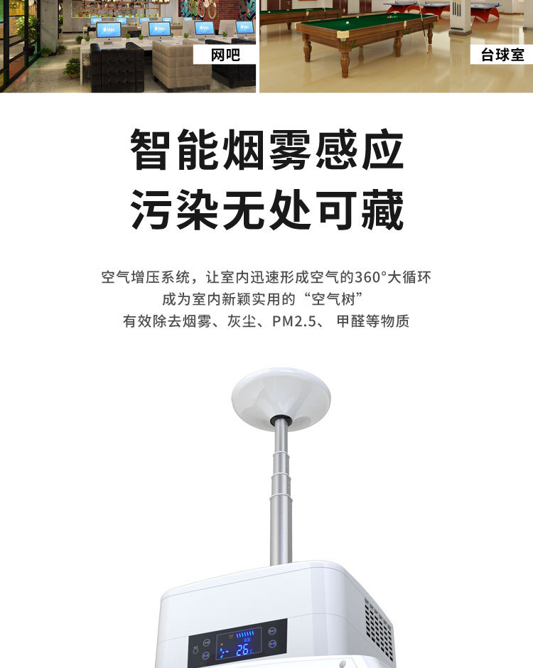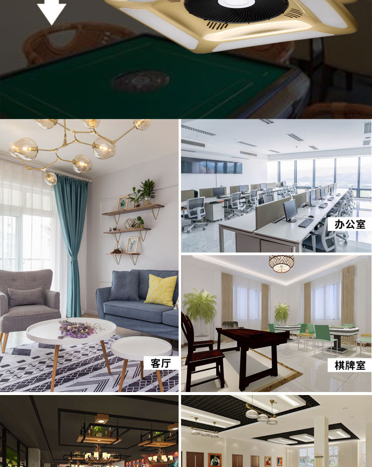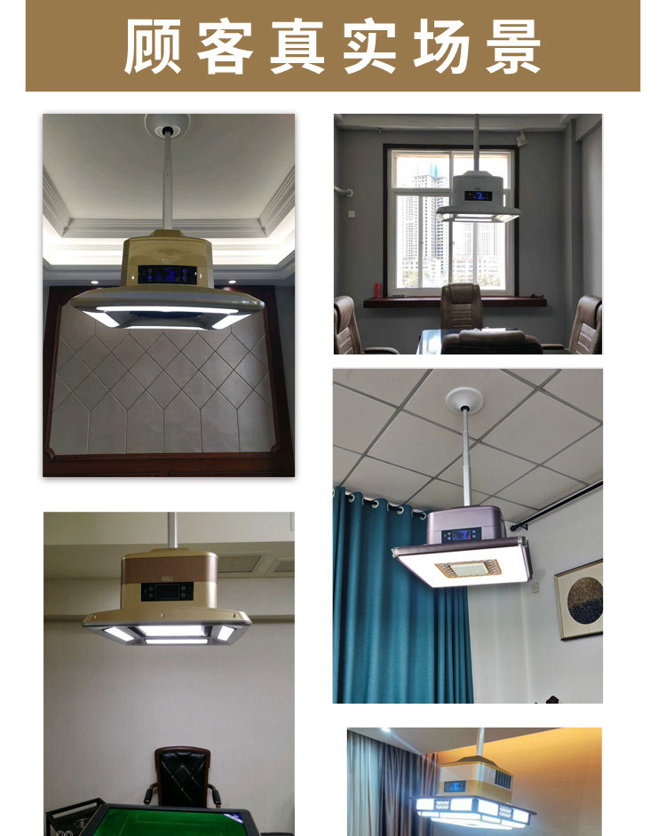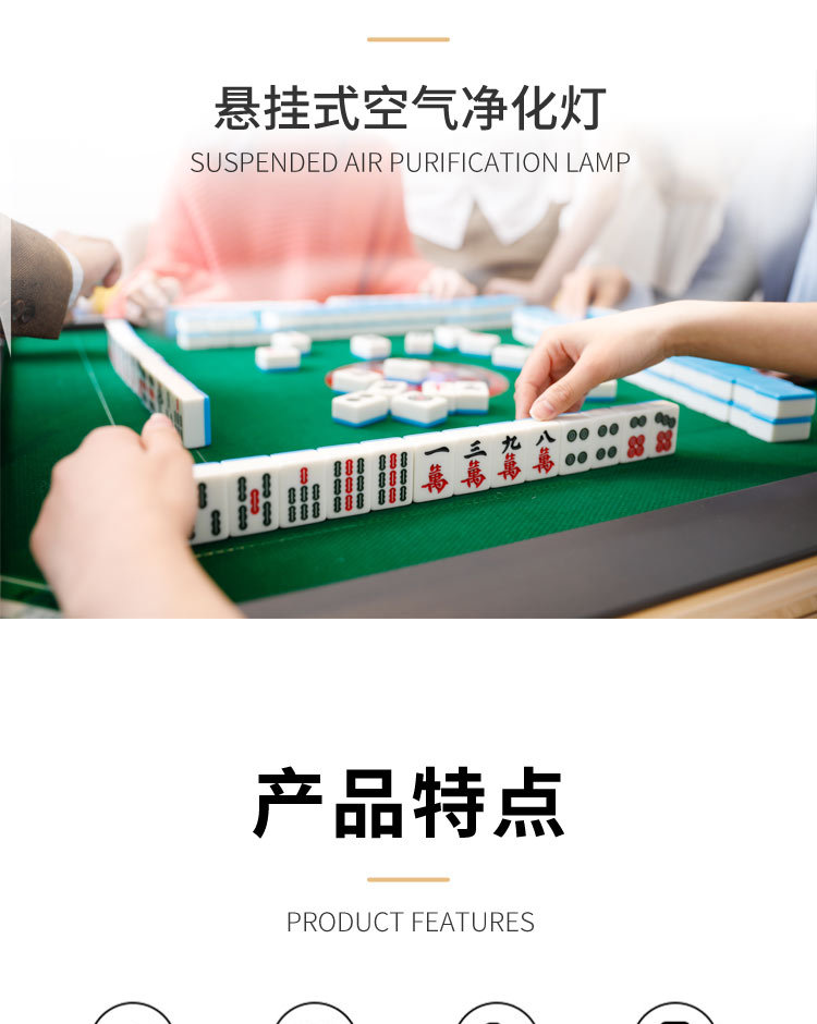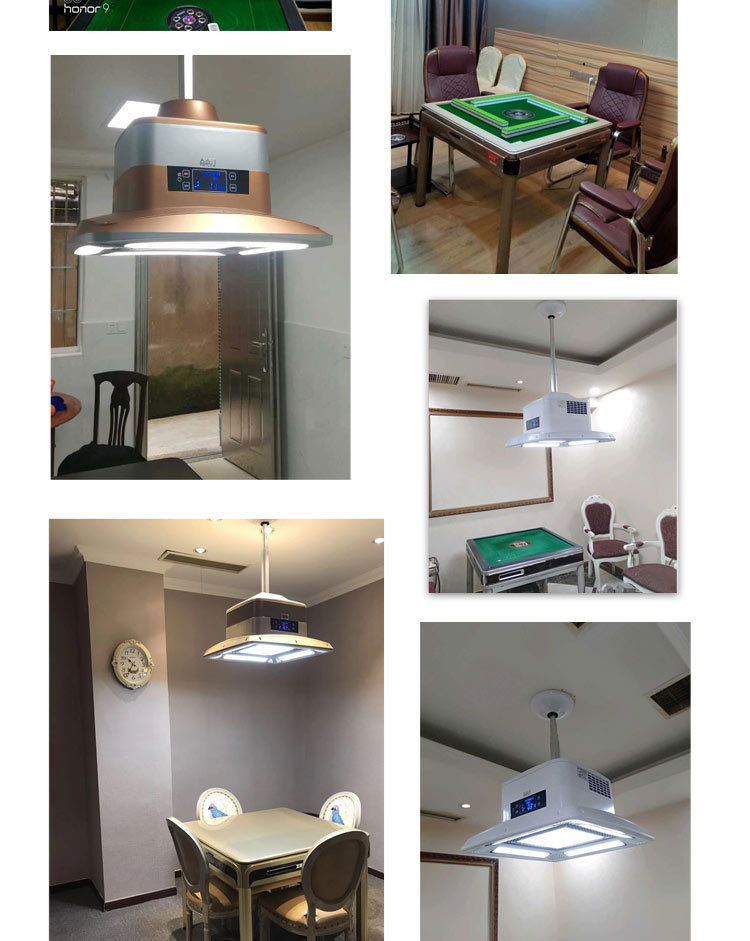 麻將館、棋牌室適用,能有效地消除室內(nèi)空氣中的煙塵、煙霧(有效地預防“二手煙”對人身體的危害)及室內(nèi)裝修產(chǎn)生的有害氣體。集空氣凈化、照明、裝飾于一體。