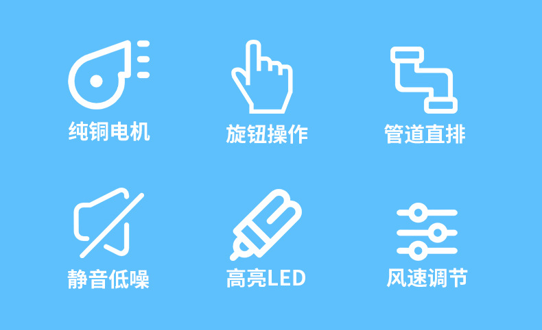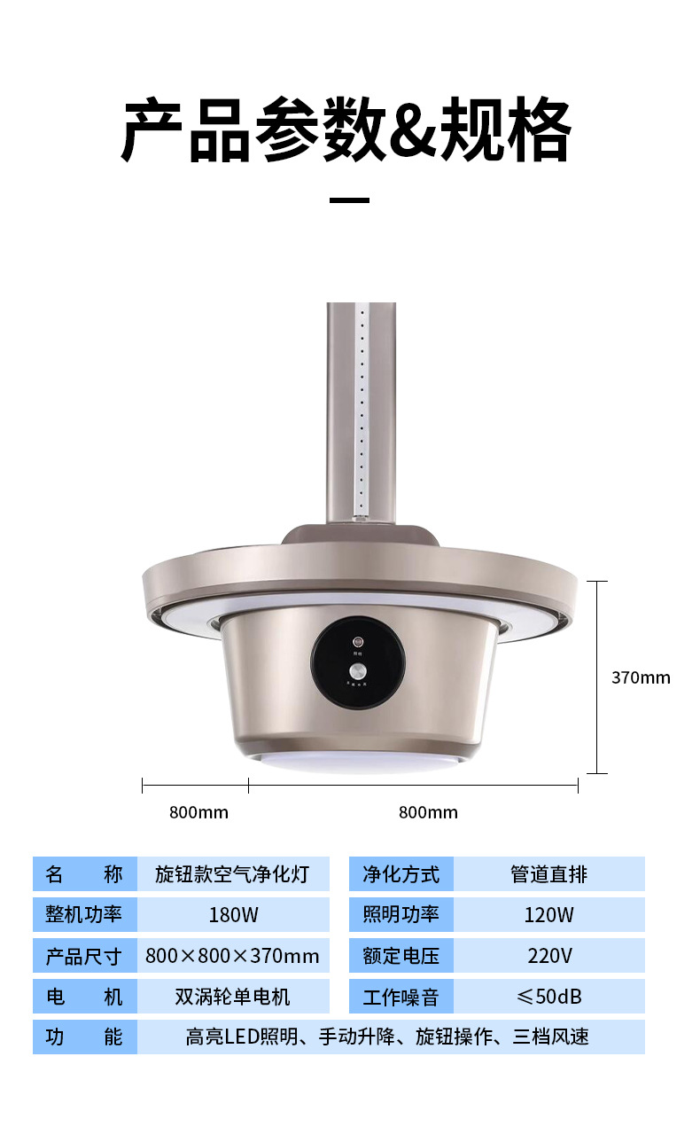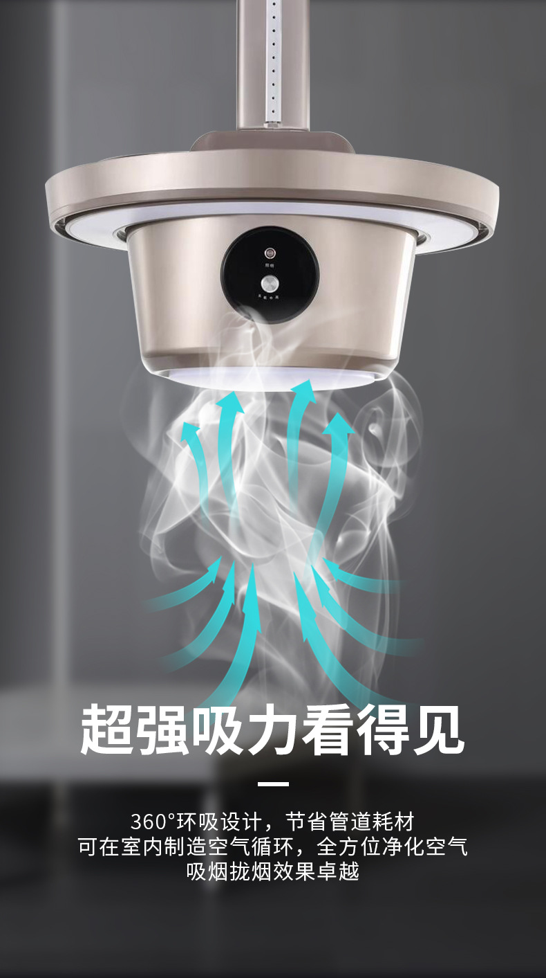 吸力大,聲音小,重量輕。360°環吸設計,節省管道耗材。可在室內制造空氣循環,全方位凈化空氣吸煙攏煙效果卓越。