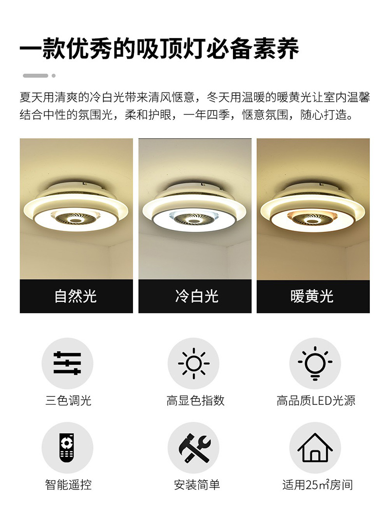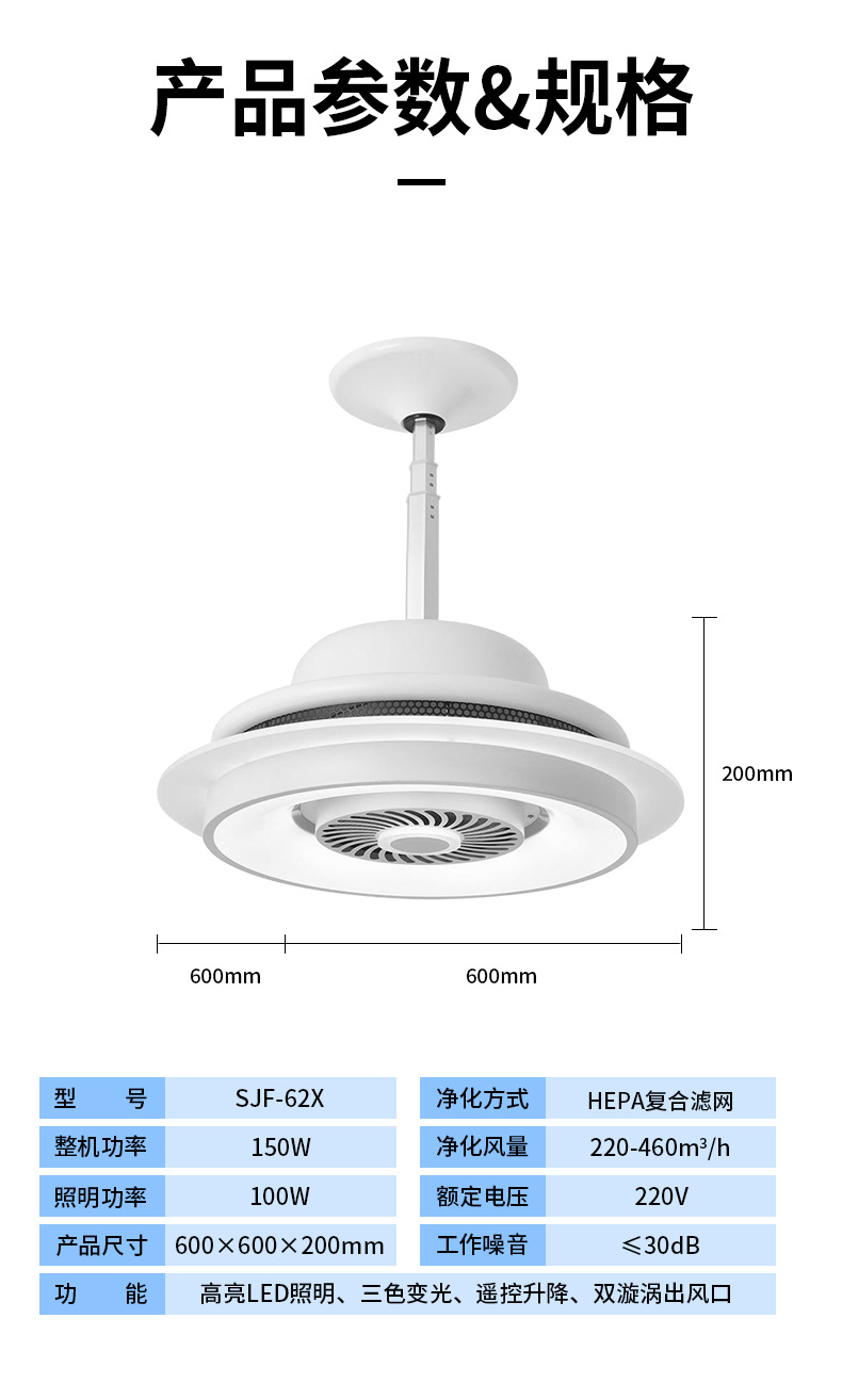 【功能】高亮LED照明、三色變光、遙控升降、雙漩渦出風口